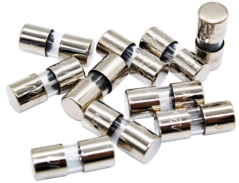 Un assortiment de fusibles en verre AGA. 10 différents fusibles en verre de 1 à 30 A