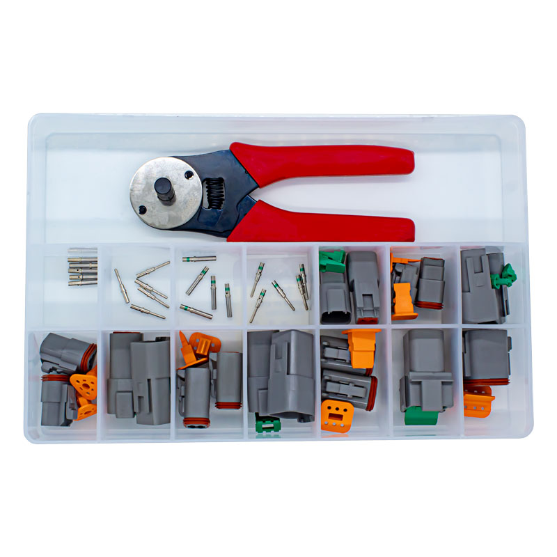 An assortment of different size Deutsch Connectors and pins with a Deutsch Crimp Tool. Make on the spot repairs to OE harnesses. Eliminates replacing the entire wire harness. Repair farm equipment, cars and light & heavy duty truck applications.