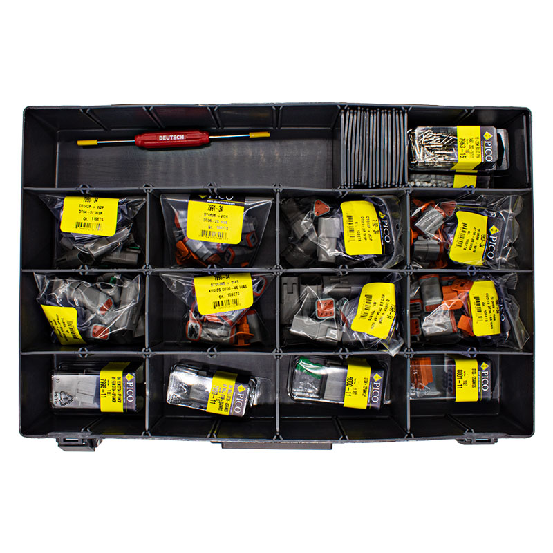 An assortment of Deutsch sockets, pins, receptacles, and wedgelocks. Includes a Deutsch Removal tool.