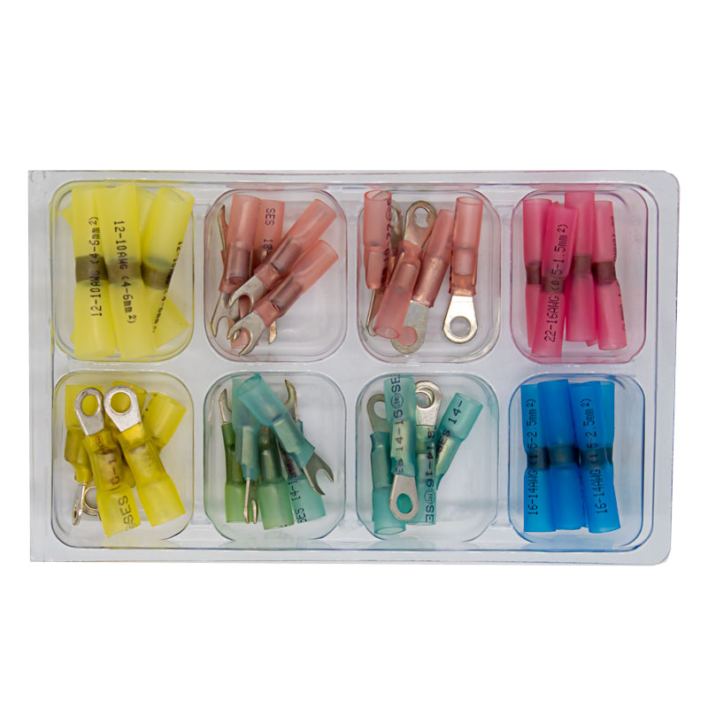 An assortment of Solder & Seal Butt, Ring, and Spade Connectors. Easy installation with pre-measured solder. Solder provides superior current flow and tensile strength.