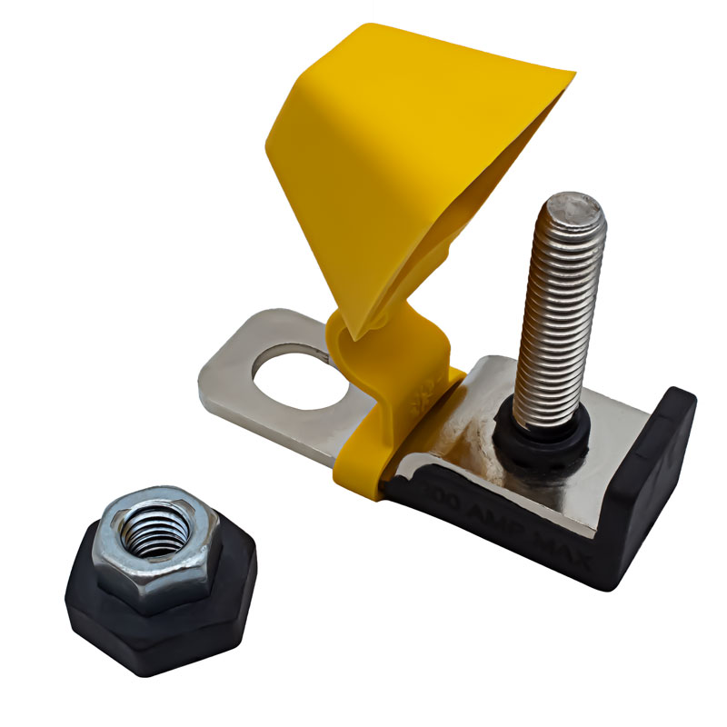 Compact, high-amp fuse holder for DC Main, inverters, windlass, bow thruster circuit protection and other electrical auxiliaries. It has an amperage rating of 300A MAX 58 V DC. With a zinc plated steel self-Locking nut and an insulating cap that prevents accidental shorts.